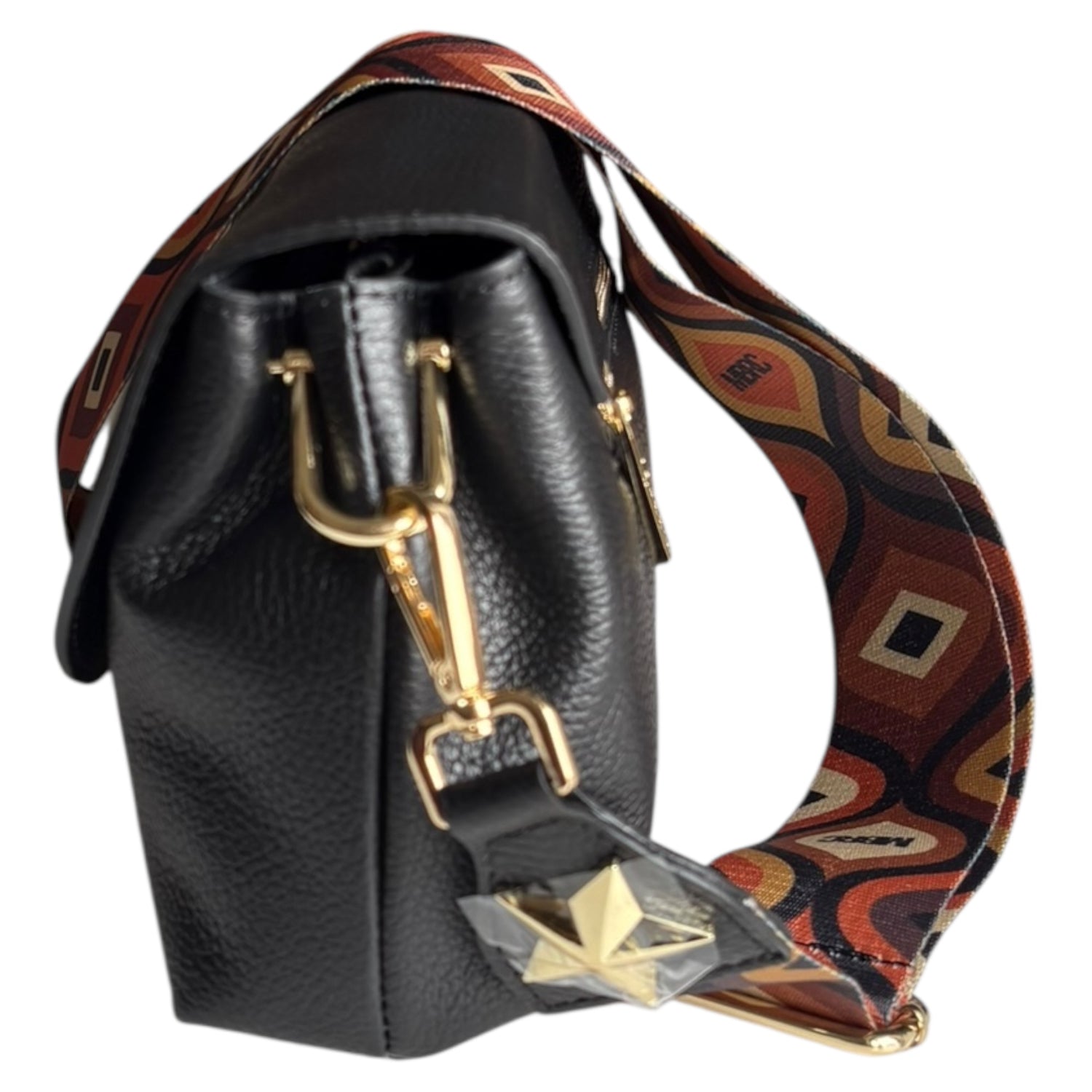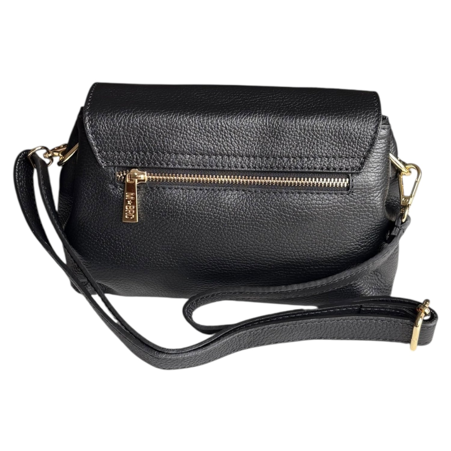 Borsa a spalla M*BRC in pelle nera con patta e bottone calamita. Misure 25x15 cm, elegante e versatile con seconda tracolla in dotazione.