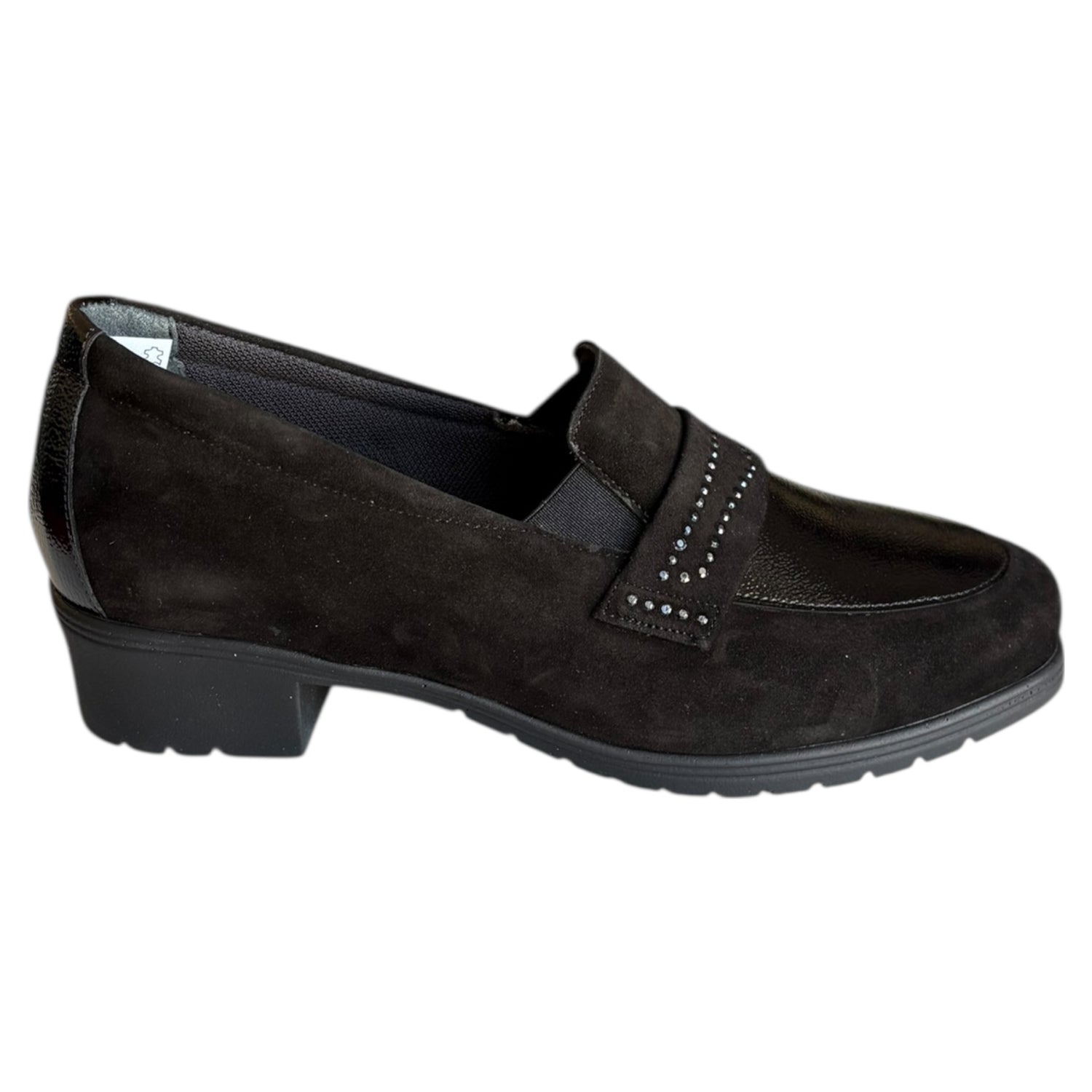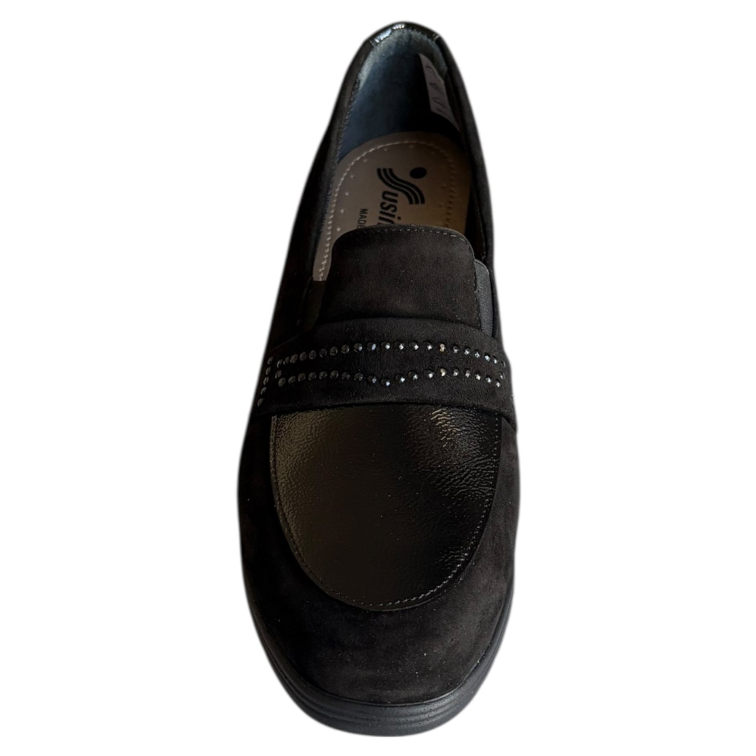 Mocassino Susimoda in ecocamoscio ed ecovernice nera con fondo in gomma e tacco 3,5 cm. Modello da infilare, elegante e confortevole, ideale per uno stile raffinato ogni giorno.