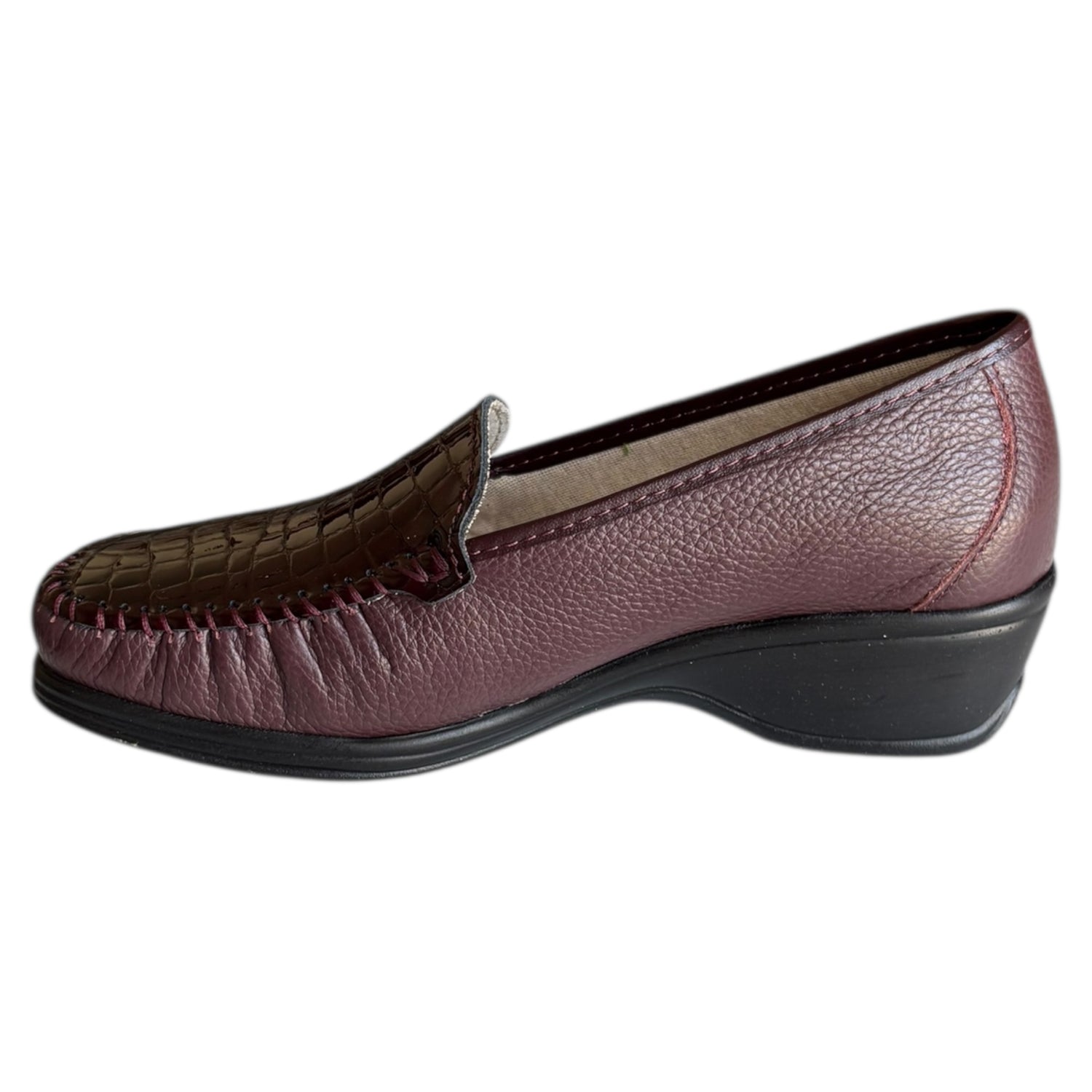Mocassino Stile di Vita da donna in pelle e vernice effetto cocco bordò con fondo in gomma e tacco 4 cm. Da infilare, con plantare estraibile, combina eleganza e comfort quotidiano.