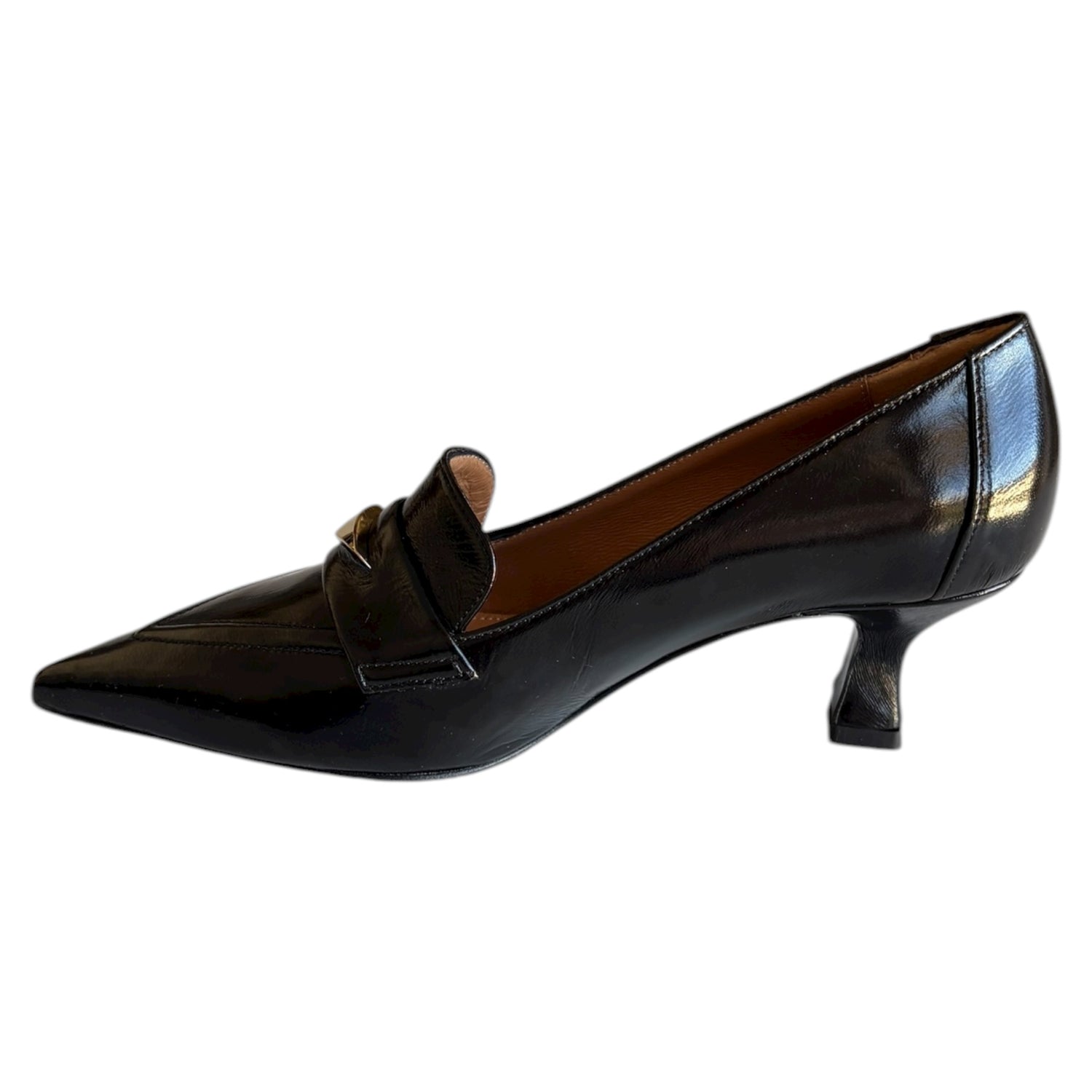 Mocassino Isabel Ferranti in pelle nera con fondo in cuoio e tacco 5 cm. Modello da infilare, elegante e confortevole, ideale per un look raffinato da giorno o da sera.