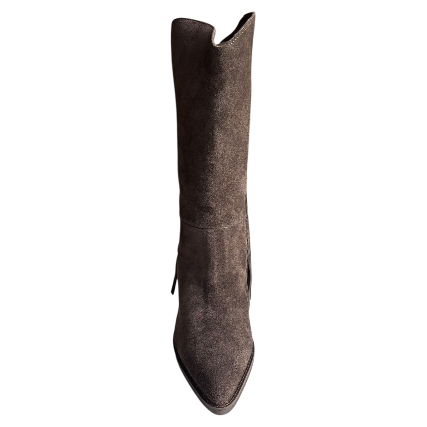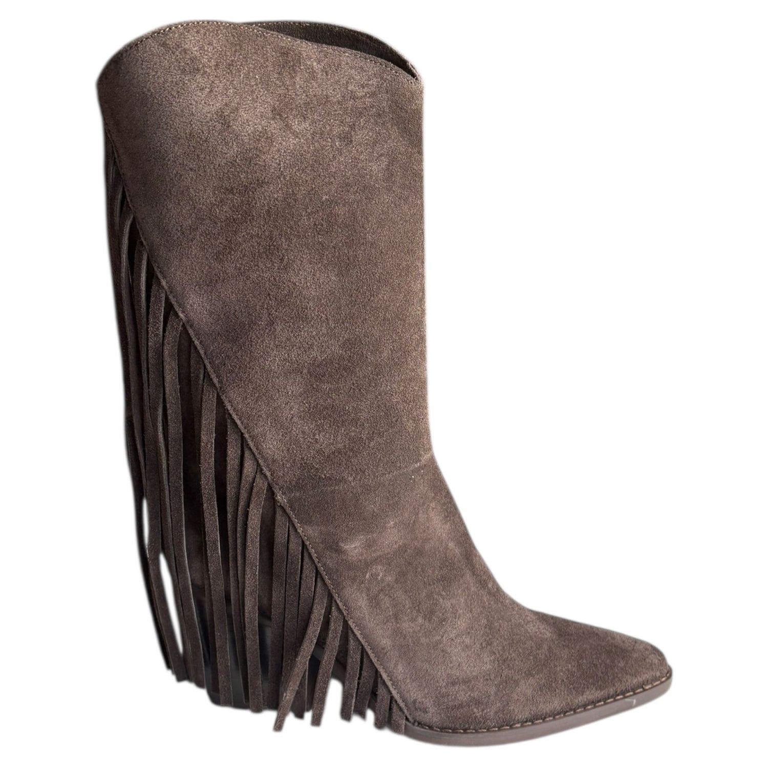 Stivale tubolare Exè Tsakiris Mallas in camoscio testa di moro con frange, fondo in gommina, tacco 8 cm e calzata da infilare. Stile boho chic e di tendenza per look eleganti.