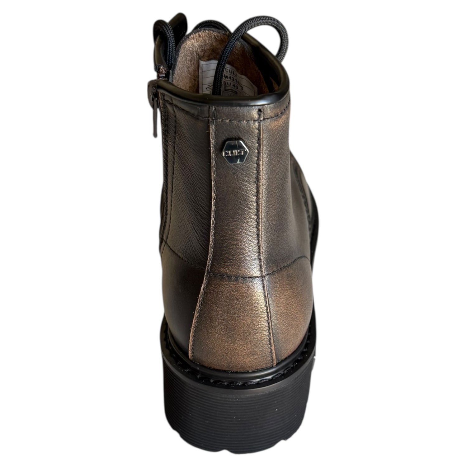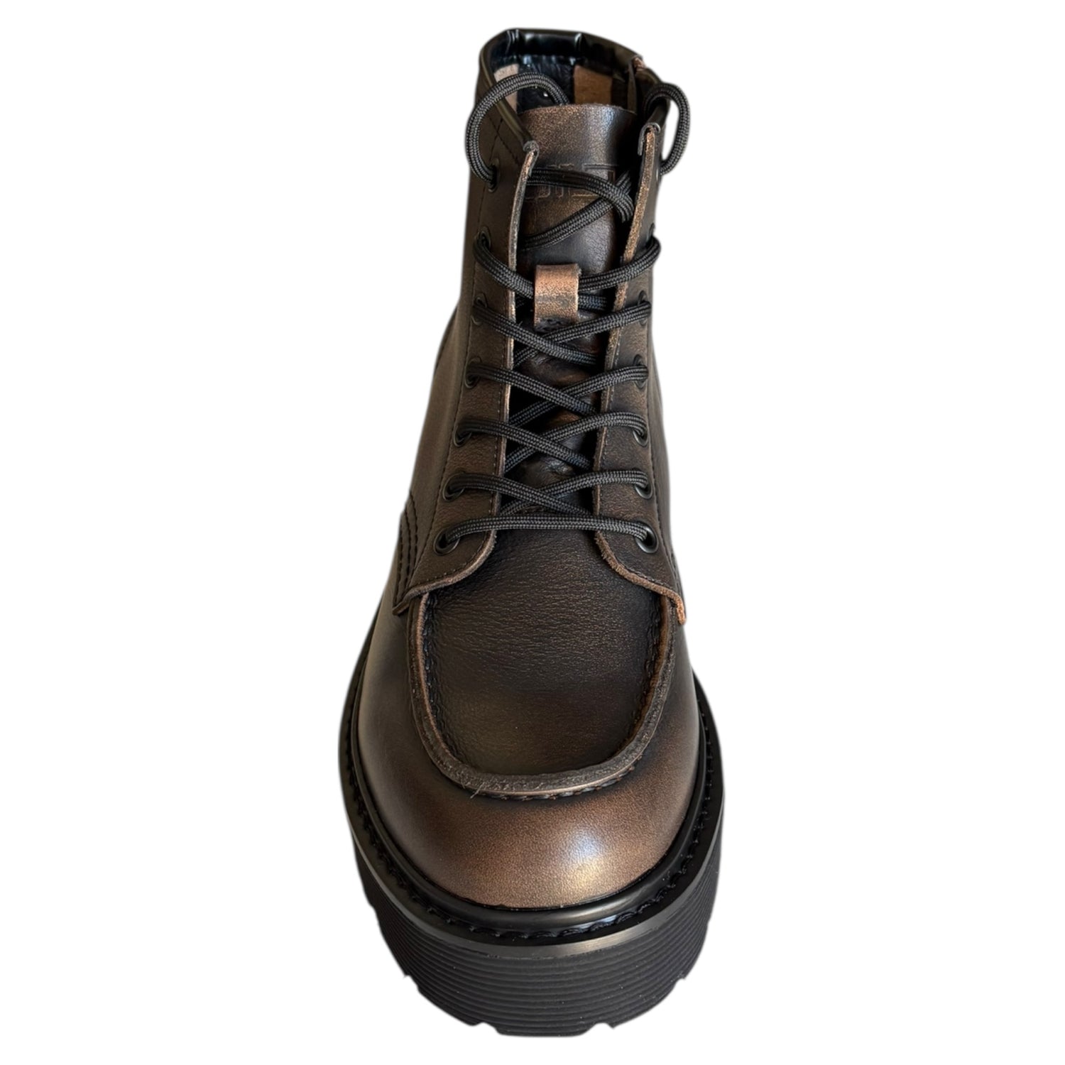 Tronchetto Cult in pelle marrone vintage con fondo in gomma e tacco 4 cm. Chiusura con lacci e cerniera per un look pratico e raffinato.