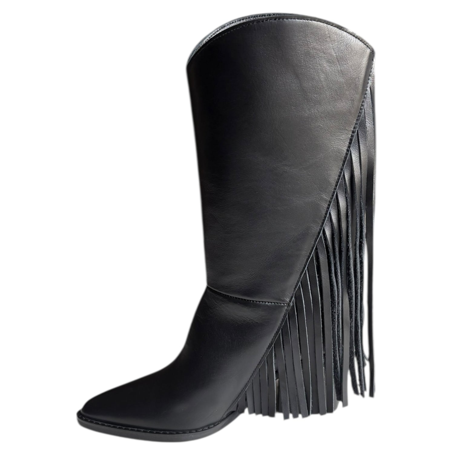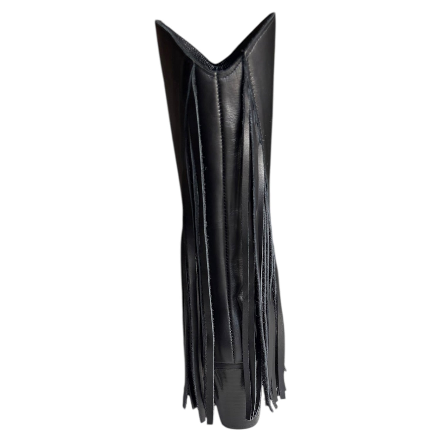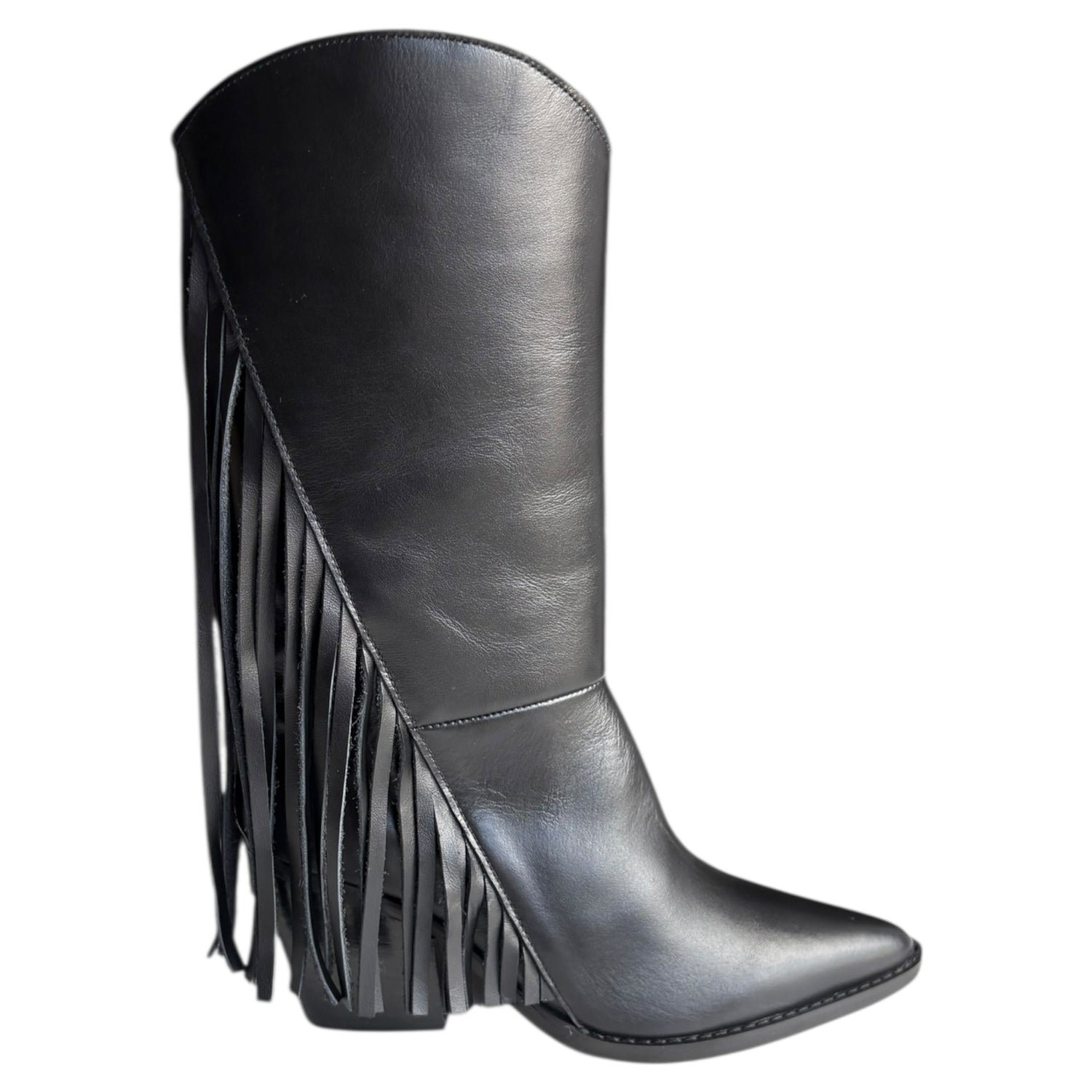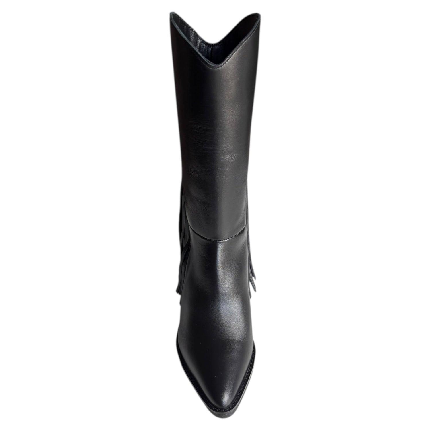 Stivale tubolare Exè Tsakiris Mallas in camoscio nero con frange, fondo in gommina, tacco 8 cm e calzata da infilare. Stile boho chic e di tendenza per look eleganti.