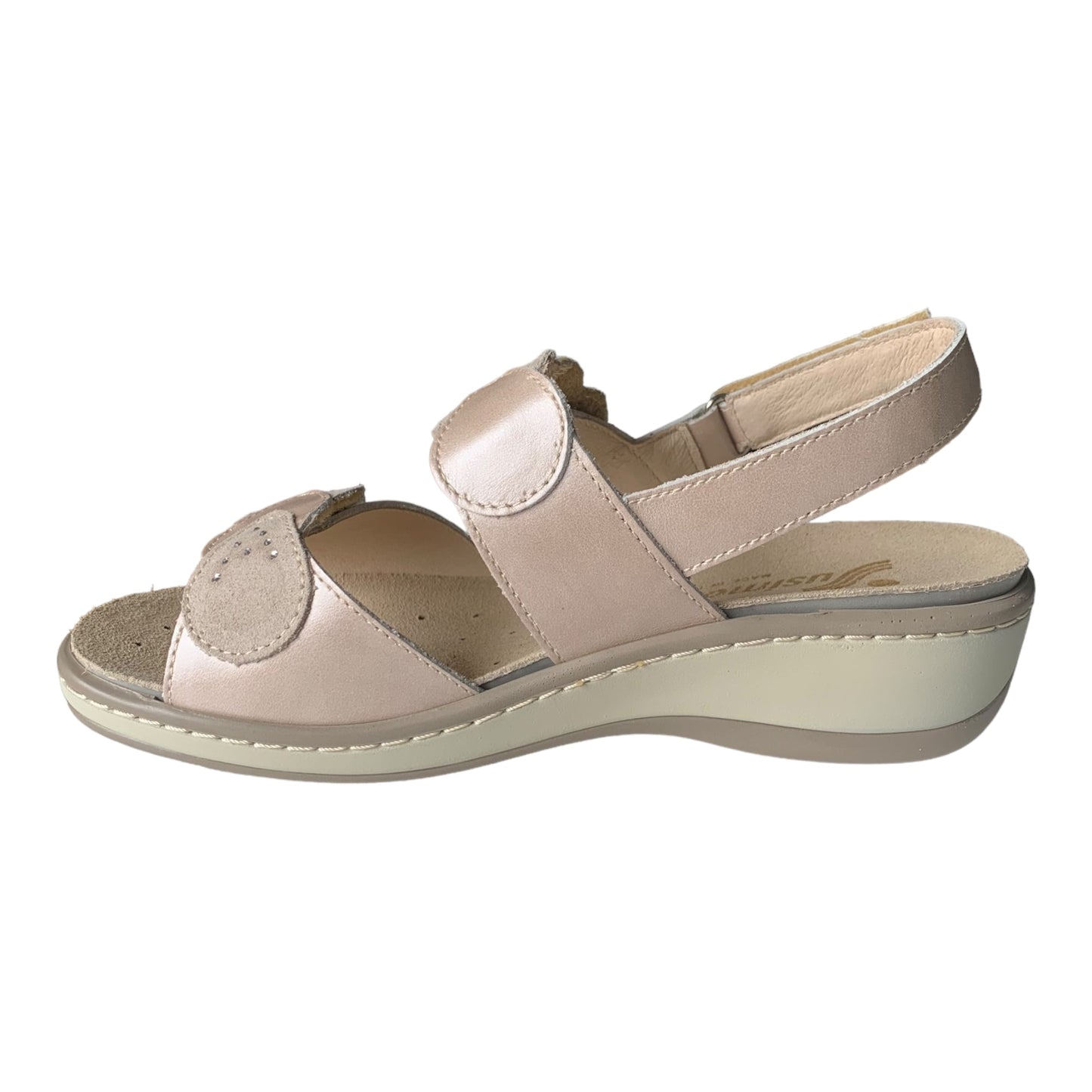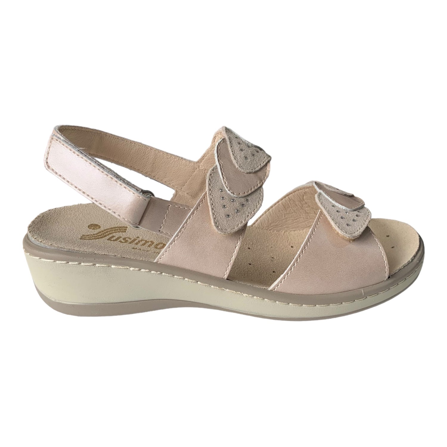 Elegante sandalo in pelle beige con fondo in gomma antiscivolo. Design confortevole con cinturino regolabile in velcro e plantare estraibile. Altezza tacco di 3,5 cm per un look femminile e sicurezza ai massimi livelli.