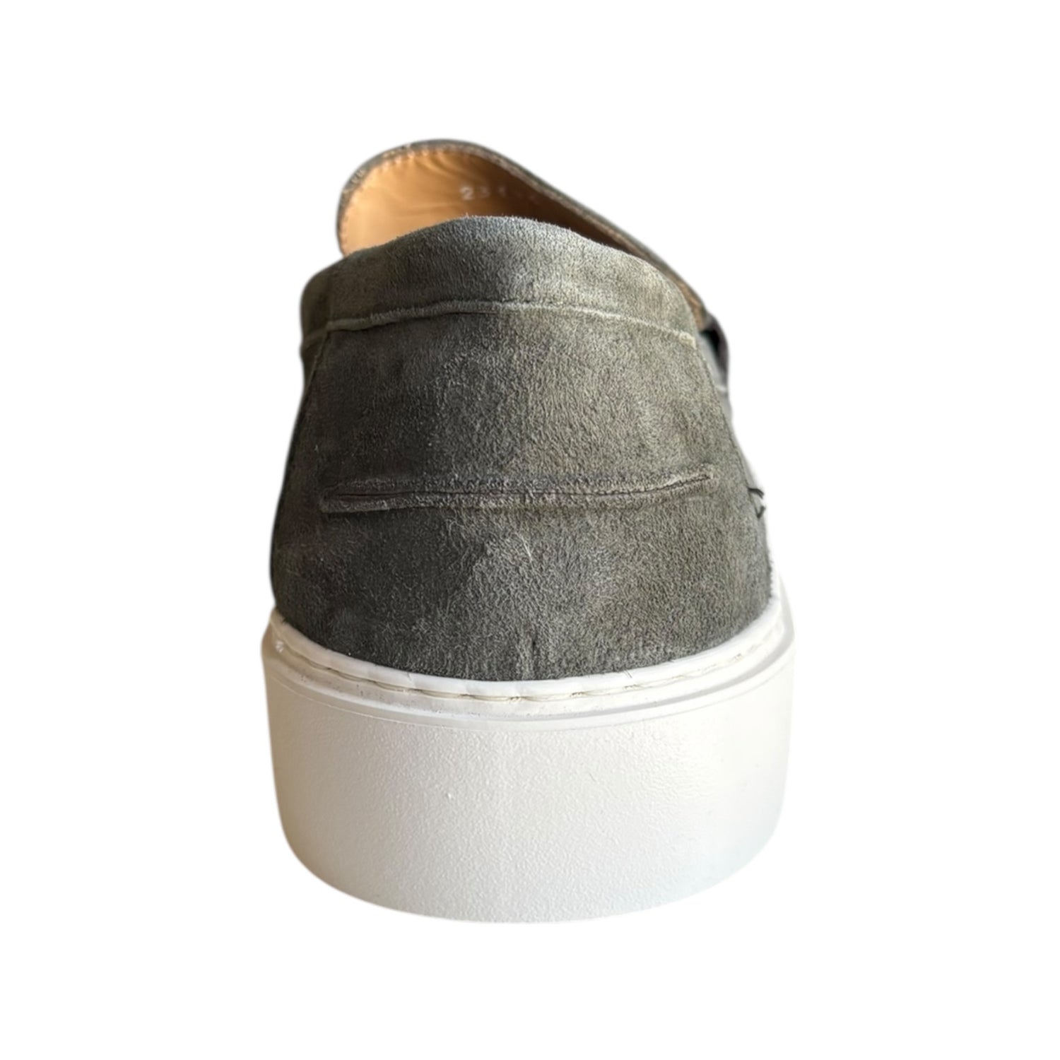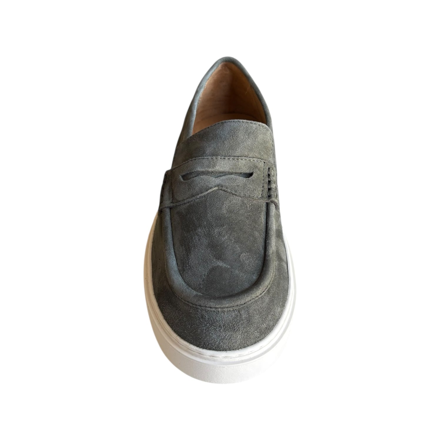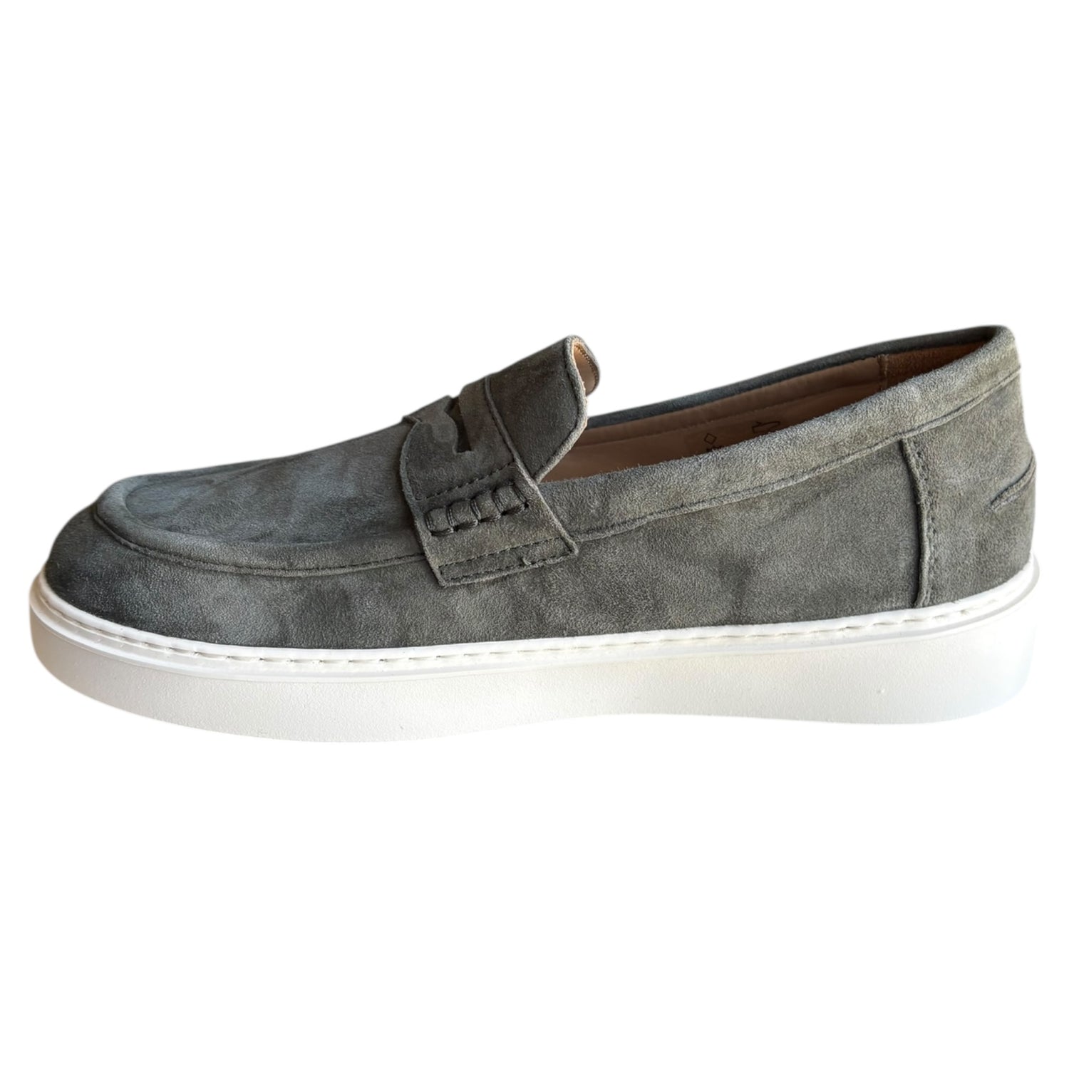 Mocassino Antica Cuoieria in camoscio verde, con fondo in gomma e tacco 3 cm. Modello slip-on da infilare, perfetto per uno stile elegante e confortevole ogni giorno.