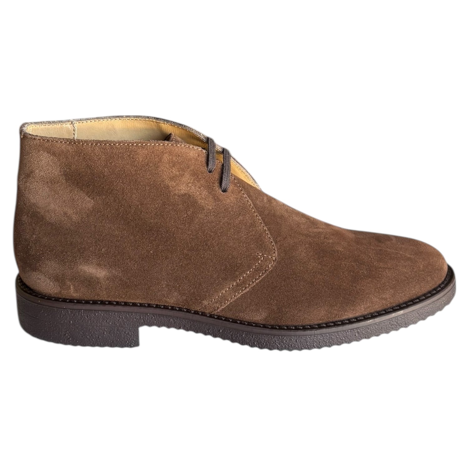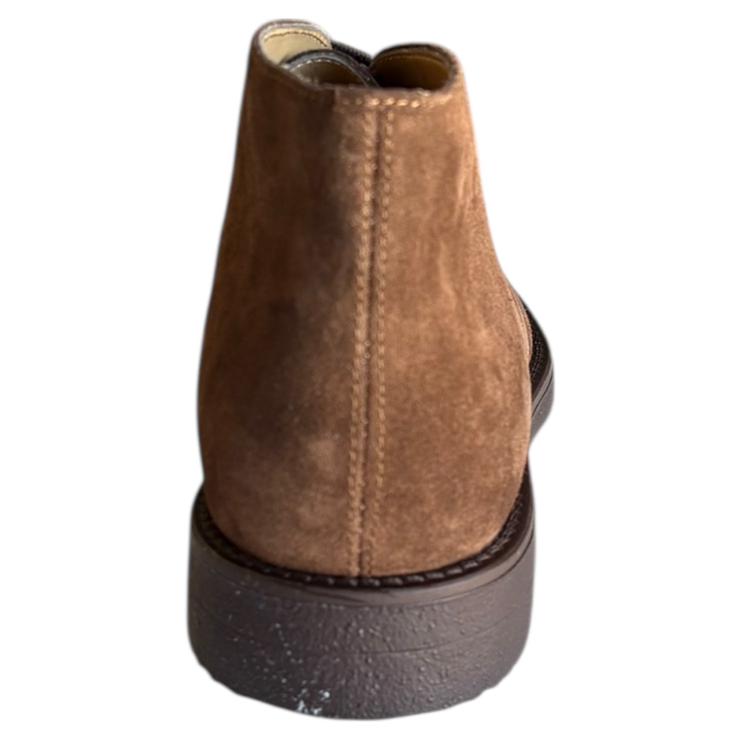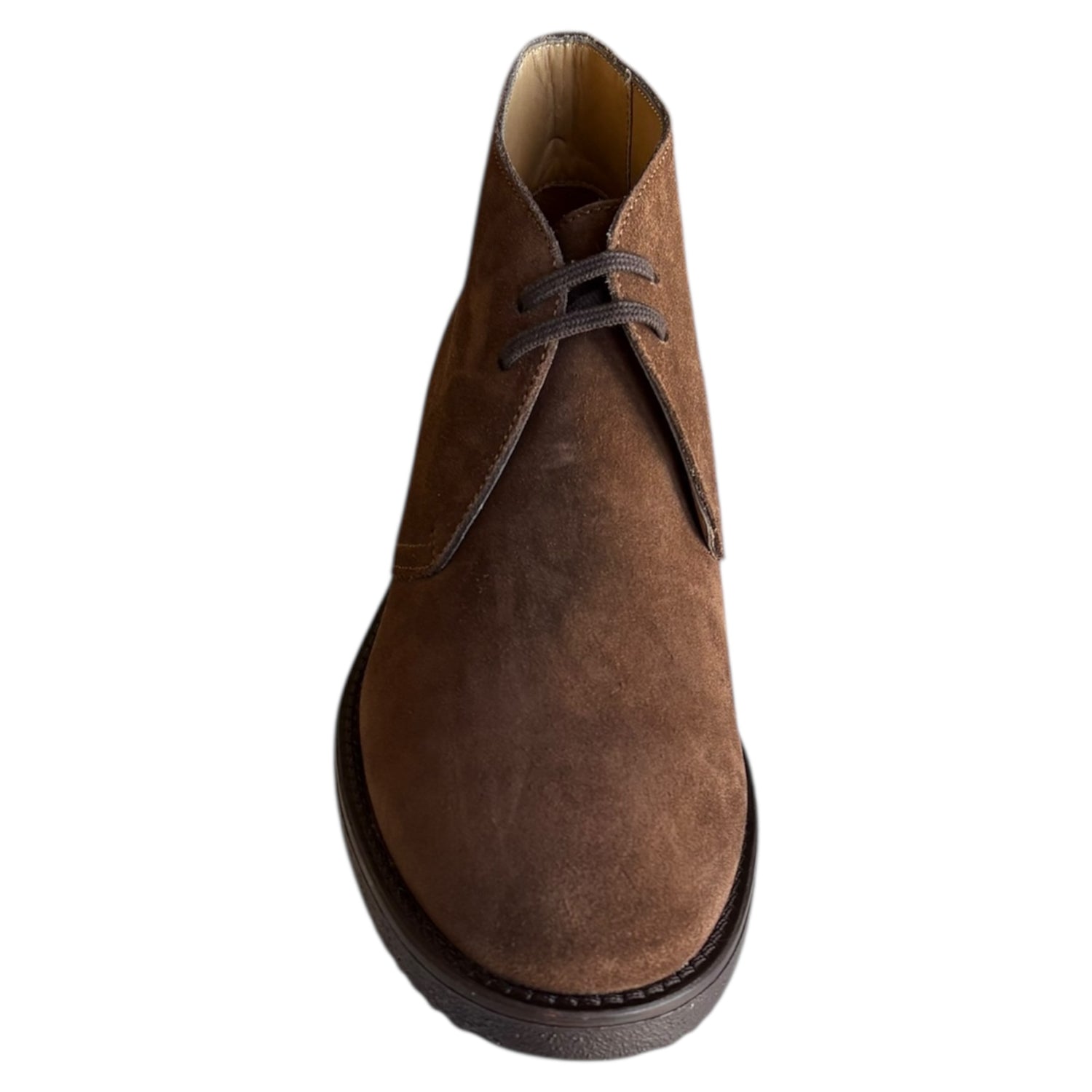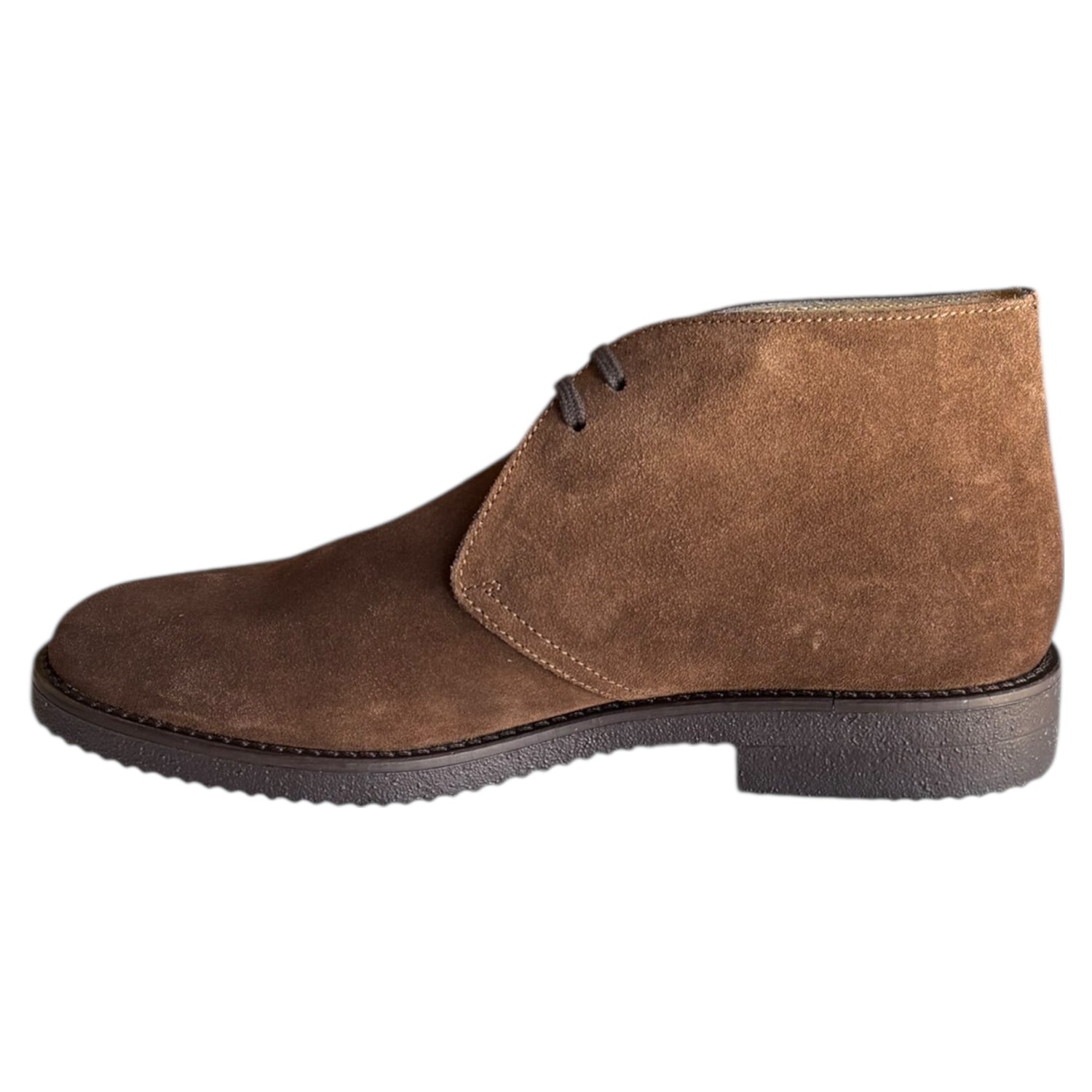Polacchino Antica Cuoieria in camoscio marrone con fondo in gomma, tacco 3 cm e chiusura a lacci. Elegante e versatile, perfetto per look maschili di tendenza.