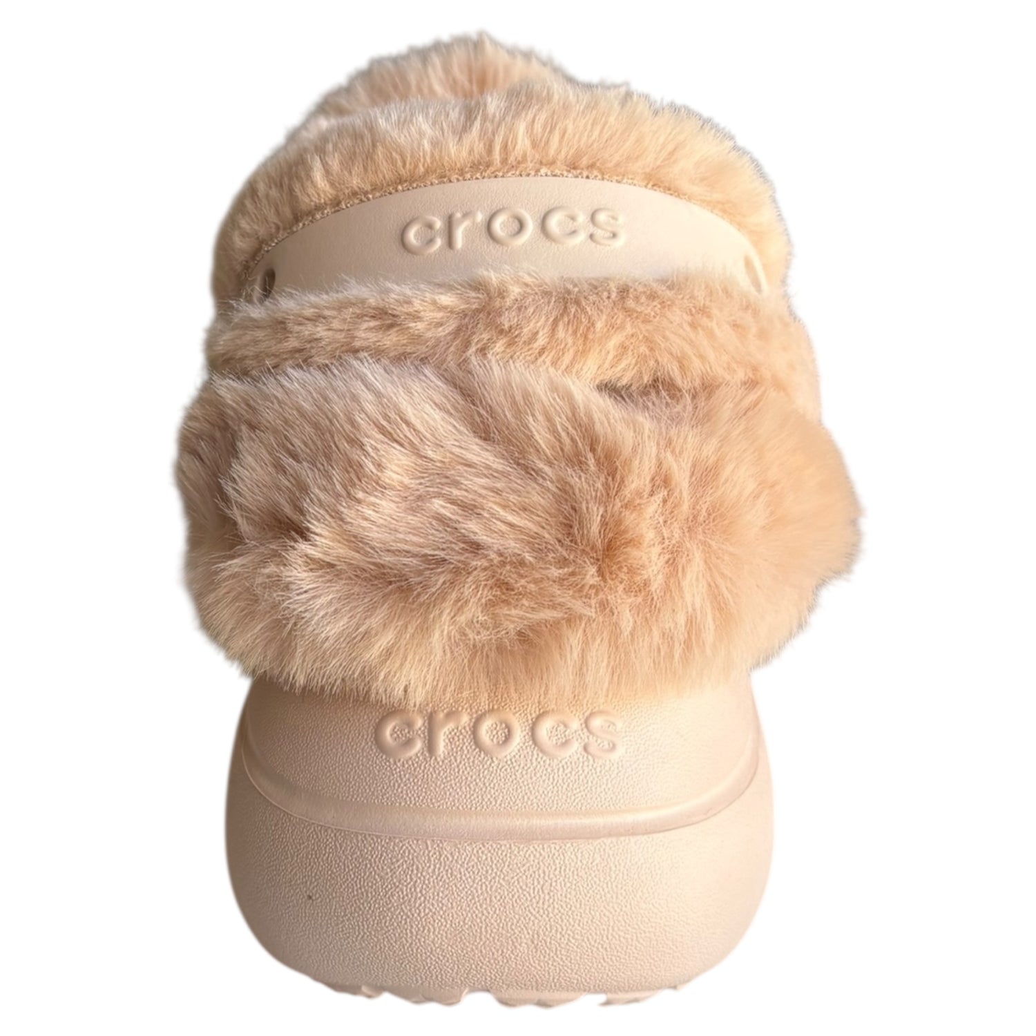 Sabot Crocs in resina Croslite e morbida ecopelliccia color cipria. Fondo leggero in Croslite, tacco 7 cm e chiusura da infilare. Comfort e stile per ogni occasione.