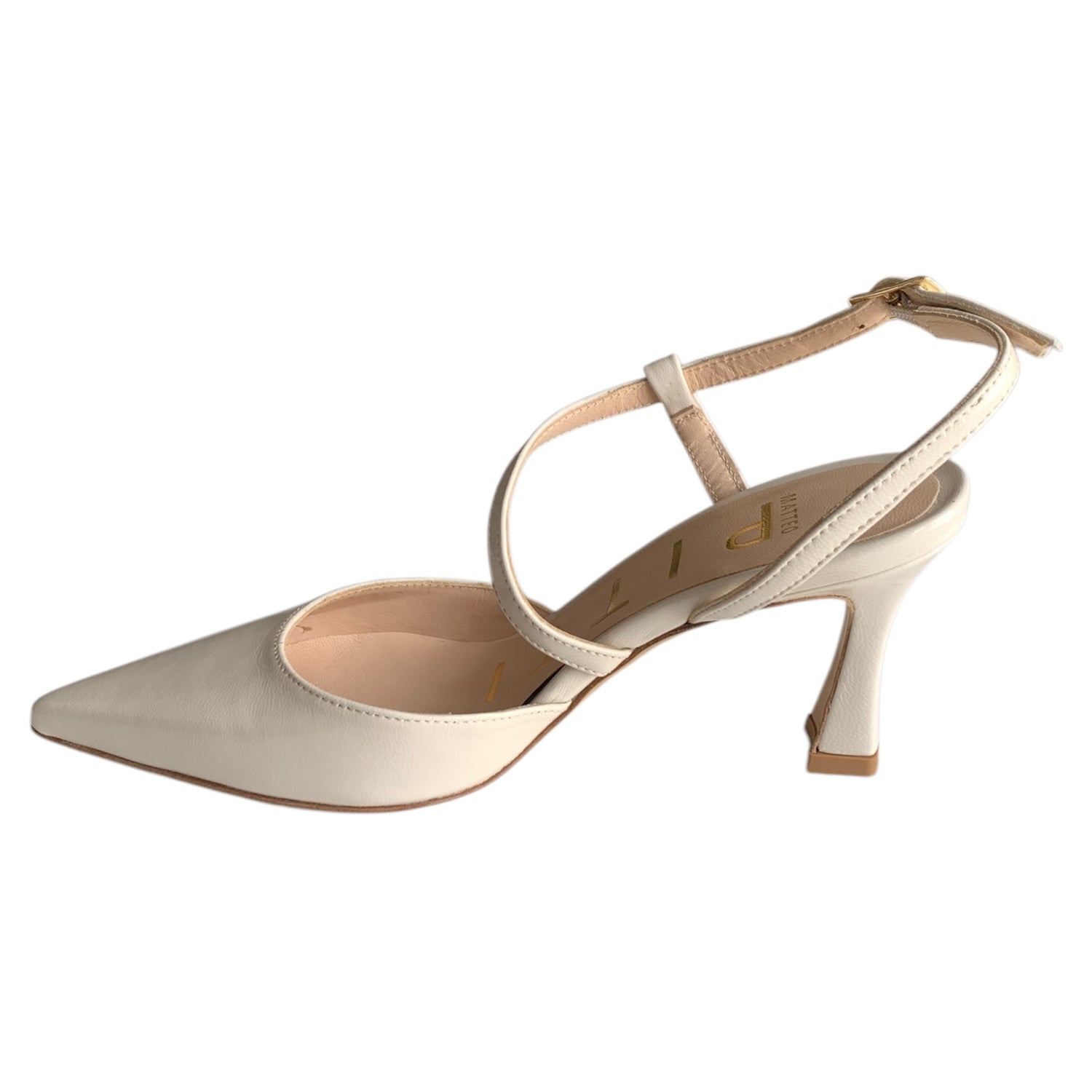 Slingback in naplak nappato color burro, elegante e luminosa. Fondo in vero cuoio, tacco di circa 8 cm e cinturino regolabile per una calzata sicura e raffinata.