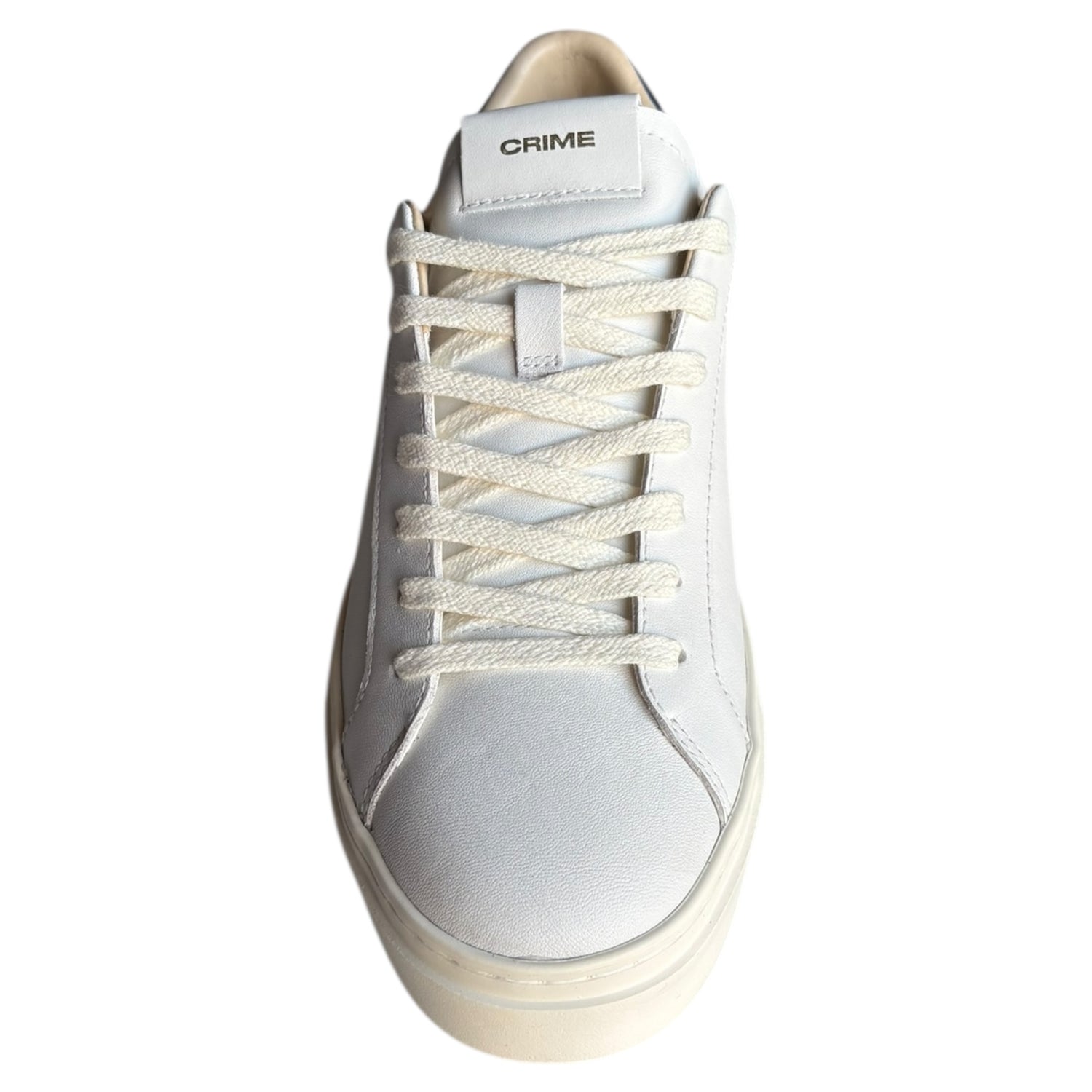 Sneakers Crime London in pelle bianca, fondo in gomma, tacco 2 cm e plantare estraibile 2 cm, chiusura a lacci. Stile sportivo e moderno, perfette per look urbani di tendenza.