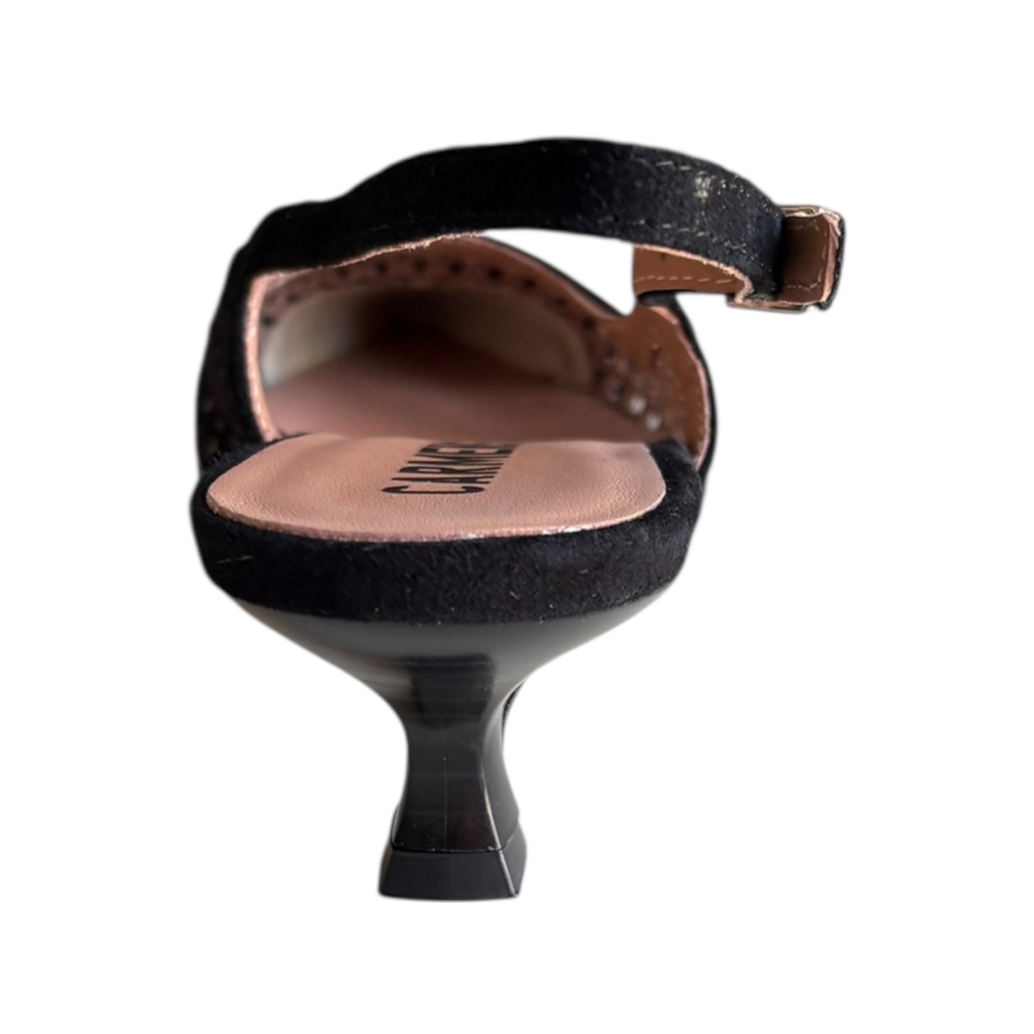 Slingback Carmens in camoscio nero, con fondo sintetico e tacco 4 cm. Cinturino regolabile per una calzata comoda, perfette per uno stile elegante e femminile.